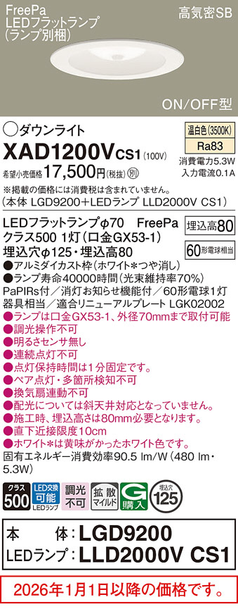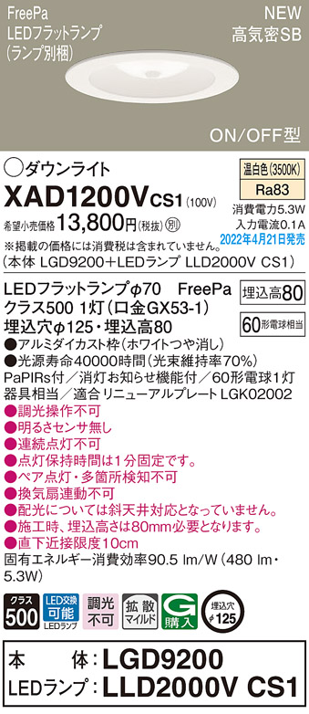 天井埋込型 LED(温白色) ダウンライト 浅型8H・高気密SB形・拡散タイプ(マイルド配光) LEDフラットランプ交換型・FreePa・ON/OFF型/埋込穴φ125 白熱電球60形1灯器具相当(LGD9200+LLD2000VCS1)