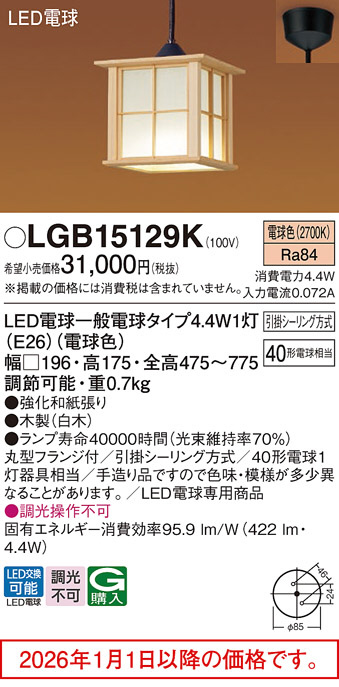 [機能/他] ランプ同梱包光源◆LED電球一般電球タイプ4.4W1灯(E26)(電球色)◆色温度:2700 K◆光源寿命40000時間(光束維持率70%)寸法・質量◆幅:□196 mm◆高:175 mm◆全高:475~775 mm 調節可能◆質量:0.7 kg仕様・注意事項◆器具光束:422 lm◆電圧:100 V◆消費電力:4.4 W◆消費効率:95.9 lm/W◆デザイン分類:書院◆【木製】白木◆天井吊下型、40形電球1灯相当(照射面中心40形電球1灯相当)・引掛シーリング方式◆Ra84◆丸型フランジ付◆引掛シーリング方式◆40形電球1灯器具相当◆手造り品ですので色味・模様が多少異なることがあります。◆LED電球専用商品◆入力電流(100V時):0.072 A◆調光操作不可
