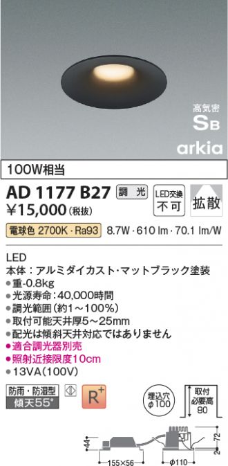 [機能/他] LED(電球色)100W相当LED本体:アルミダイカスト・マットブラック塗装●幅-φ110 出幅-2 埋込穴径-φ100 埋込高-72mm 重-0.8kg●消費電力:8.7W●定格光束:610 lm●固有エネルギー消費効率:70.1 lm/W●演色性:Ra93●色温度:2700K●光束維持時間:40,000時間●調光範囲(約1~100%)●取付可能天井厚5~25mm●配光は傾斜天井対応ではありません●照射近接限度10cm●適合調光器別売●13VA(100V)