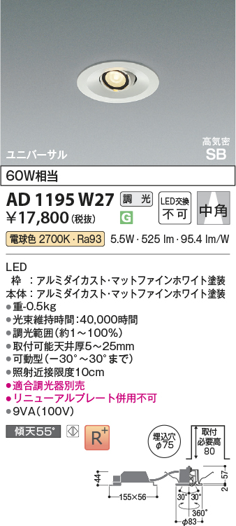 ●幅-φ83 出幅-2 埋込穴径-φ75 埋込高-57mm 重-0.5kg