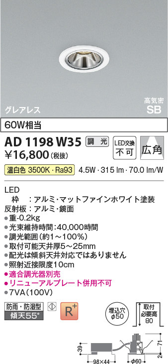 ●幅-φ60 出幅-2 埋込穴径-φ50 埋込高-71mm 重-0.2kg