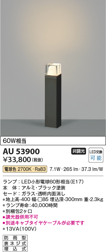 [機能/他] LED(電球色)60W相当ランプ:LED小形電球60形相当(E17)本体:アルミ・ブラック塗装セード:ガラス・透明内面消し●地上高-400 幅-□85 埋込深-300mm 重-2.3kg●消費電力:7.1W●定格光束:265 lm●固有エネルギー消費効率:37.3 lm/W●演色性:Ra83●色温度:2700K●ランプ寿命:40,000時間●別梱包2ヶ口●調光器併用不可●別途キャブタイヤケーブルが必要です●13VA(100V)