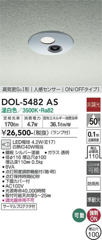 [機能/他] LED電球 4.2W(E17) 温白色/3500Kサーマルプロテクタ付防雨形径φ116 埋込穴φ100 埋込深110mm0.5kg鋼板 シルバー塗装ガラス 透明高気密SGI形人感センサーON/OFFタイプI●点灯照度調節機能付(暗・明)●点灯保持時間60秒●下面カバー付●AC100V●光源寿命40,000時間●取付可能天井厚5~25mm●調光器併用不可●8VA定格光束 170lm消費電力 4.7W固有エネルギー消費効率 36.1lm/WRa82白熱灯40W相当