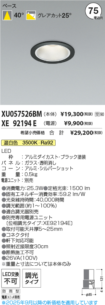 [機能/他] LEDランプLED(温白色)LED枠:アルミダイカスト・ブラック塗装パネル:ガラス・透明消しコーン:アルミ・シルバーショット重量:0.5kg電源ユニット:別売●消費電力:25.3W●色温度:3500K●演色性:Ra92●定格光束:1500 lm●固有エネルギー消費効率:59.2 lm/W●光束維持時間:40,000時間●調光範囲(約1~100%)●適合調光器別売●別売専用電源ユニット(位相調光タイプ:XE92194E)●取付可能天井厚5~25mm●照射近接限度30cm●軒下対応可能●コネクタ付●断熱施工不可●26VA(100V)※重量と寸法については本体のみ