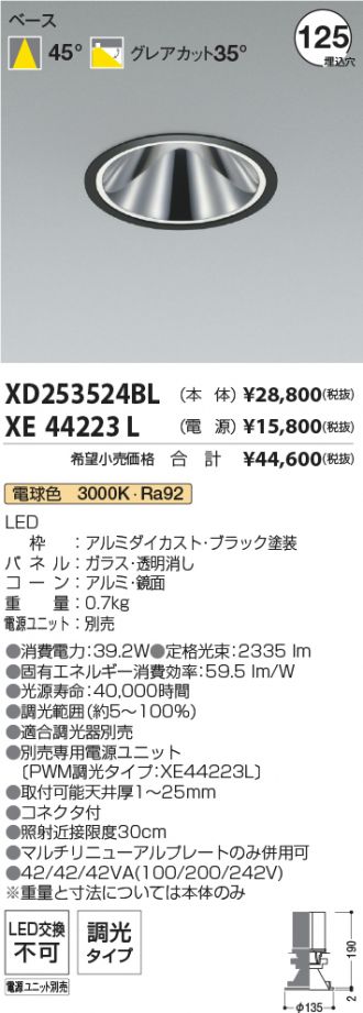 [機能/他] LED枠:アルミダイカスト・ブラック塗装パネル:ガラス・透明消しコーン:アルミ・鏡面LED(電球色)重量:0.7kg電源ユニット:別売●色温度:3000KLEDランプ●演色性:Ra92●光源寿命:40,000時間●専用電源ユニット別売●適合調光器別売●コネクタ付●取付可能天井厚1~25mm●照射近接限度30cm●マルチリニューアルプレートのみ併用可