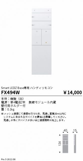 [機能/他] Smart LEDZ Base専用 ハンディリモコン本体:樹脂(白)電源:単4電池2本 無線モジュール内蔵壁付用ホルダー付 重:0.1kg※ メッシュ通信にて通信を行うため、見通し距離20m以内にシステムに含まれるデバイスを最低1台設置してください。見通しが効くデバイスが多いほど通信精度が向上します。
