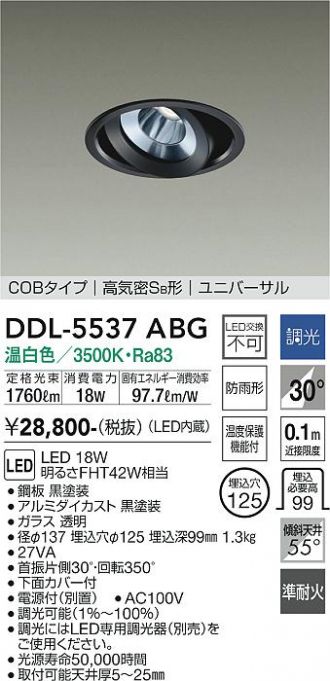 [機能/他] LED 18W 温白色/3500K鋼板 黒塗装アルミダイカスト 黒塗装ガラス 透明径φ137 埋込穴φ125 埋込深99mm1.3kg●首振片側30°・回転350°●下面カバー付●電源付(別置)●AC100V●調光可能(1%~100%)●調光にはLED専用調光器(別売)をご使用ください。●光束維持時間50,000時間●取付可能天井厚5~25mm●27VA定格光束 1760 lm消費電力 18 W固有エネルギー消費効率 97.7 lm/WRa83明るさFHT42W相当傾斜天井にも使用可能(55°まで)