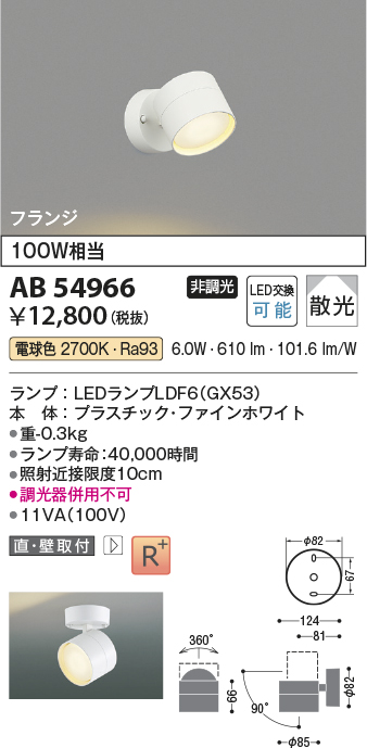 [機能/他] LED(電球色)100W相当ランプ:LEDランプLDF6(GX53)本体:プラスチック・ファインホワイト●出幅-124 本体幅-φ85mm 重-0.3kg●消費電力:6.0W●定格光束:610 lm●固有エネルギー消費効率:101.6 lm/W●演色性:Ra93●色温度:2700K●ランプ寿命:40,000時間●照射近接限度10cm●調光器併用不可●11VA(100V)