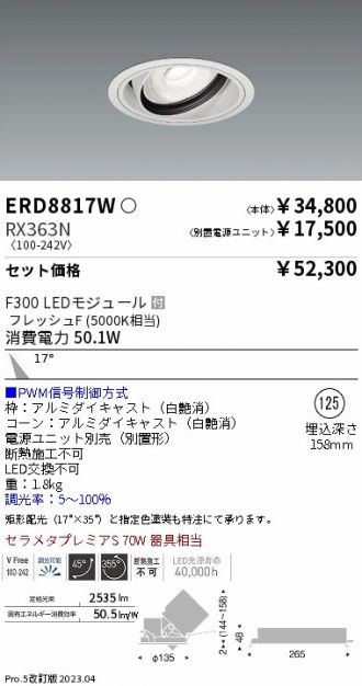 [機能/他] F300 LEDモジュール付フレッシュF (5000K相当)消費電力 50.1W17°■PWM信号制御方式枠:アルミダイキャスト(白艶消)コーン:アルミダイキャスト(白艶消)電源ユニット別売(別置形)断熱施工不可LED交換不可重:1.8kg調光率:5-100%矩形配光(17°×35°)と指定色塗装も特注にて承ります。158mm定格光束:2535lm (50.5lm/W)セラメタプレミアS 70W 器具相当