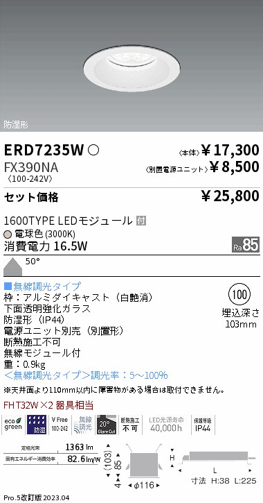 [機能/他] 1600TYPE LEDモジュール付電球色消費電力 16.5W50°■無線調光タイプ枠:アルミダイキャスト(白艶消)下面透明強化ガラス 防湿形(IP44)電源ユニット別売(別置形)断熱施工不可無線モジュール付重:0.9kg<無線調光タイプ>調光率:5-100%※天井面より110mm以内に障害物がある場合は取付できません。103mm定格光束:1363lm (82.6lm/W)FHT32W×2 器具相当