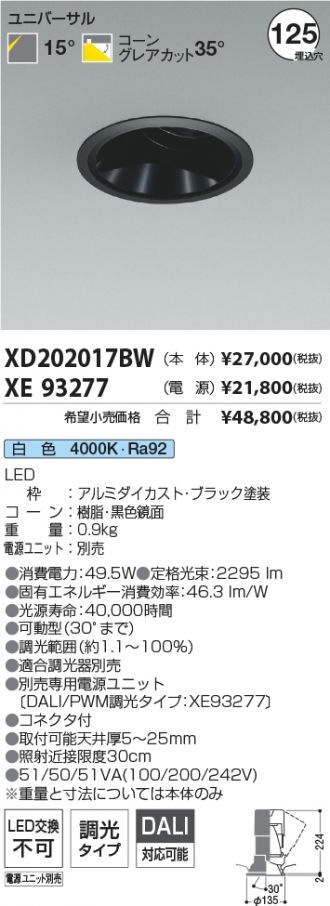 [機能/他] LED枠:アルミダイカスト・ブラック塗装コーン:樹脂・黒色鏡面重量:0.9kgLED(白色)電源ユニット:別売●消費電力:49.5W●色温度:4000KLEDランプ●演色性:Ra92●定格光束:2295 lm●固有エネルギー消費効率:46.3 lm/W●光源寿命:40,000時間●調光範囲(約1.1~100%)●可動型(30°まで)●別売専用電源ユニット〔DALI/PWM調光タイプ:XE93277〕●取付可能天井厚5~25mm●適合調光器別売●コネクタ付●照射近接限度30cm●51/50/51VA(100/200/242V)※重量と寸法については本体のみ
