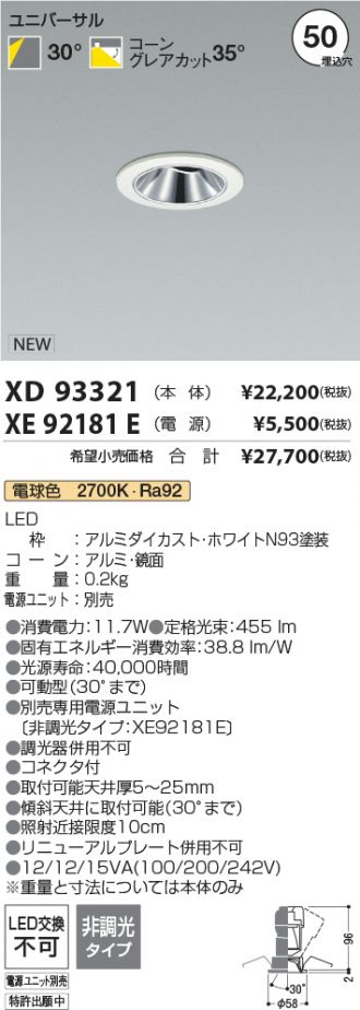[機能/他] LED枠:アルミダイカスト・ホワイトN93塗装コーン:樹脂・鏡面重量:0.2kgLED(電球色)電源ユニット:別売●色温度:2700K●演色性:Ra92LEDランプ●光源寿命:40,000時間●可動型(30°まで)●専用電源ユニット別売●適合調光器別売●コネクタ付●取付可能天井厚5~25mm●傾斜天井に取付可能(30°まで)●照射近接限度10cm●リニューアルプレート併用不可