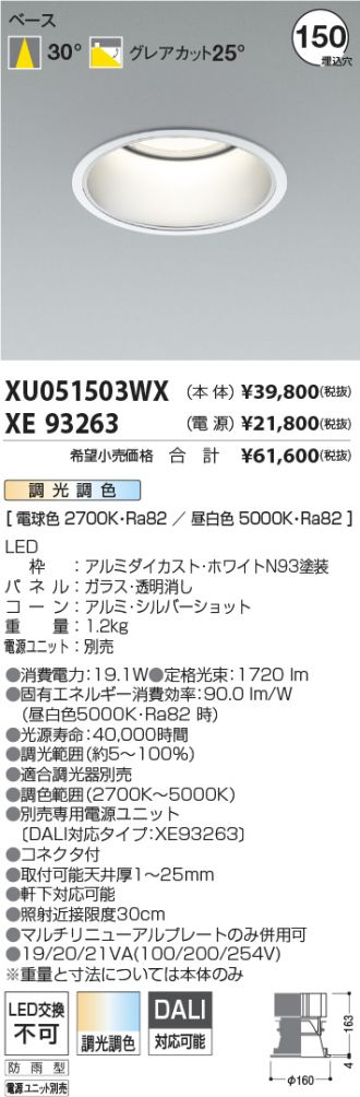 [機能/他] LED枠:アルミダイカスト・ホワイトN93塗装パネル:ガラス・透明消しコーン:アルミ・シルバーショットLED(電球色+昼白色)重量:1.2kg電源ユニット:別売●消費電力:19.1WLEDランプ●色温度:2700K~5000K●演色性:Ra82●定格光束:1720 lm●固有エネルギー消費効率:90.0 lm/W(昼白色5000K・Ra82 時)●光源寿命:40,000時間●調光範囲(約5~100%)●調色範囲(2700K~5000K)●別売専用電源ユニット〔DALI対応タイプ:XE93263〕●取付可能天井厚1~25mm●軒下対応可能●適合調光器別売●マルチリニューアルプレートのみ併用可●コネクタ付●照射近接限度30cm