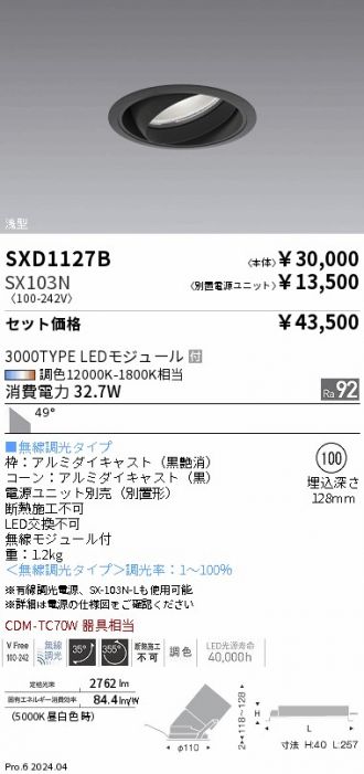 [機能/他] 3000TYPE LEDモジュール付調色12000K-1800K相当消費電力 32.7W49°■無線調光タイプ枠:アルミダイキャスト(黒艶消)コーン:アルミダイキャスト(黒)電源ユニット別売(別置形)断熱施工不可LED交換不可無線モジュール付重:1.2kg<無線調光タイプ>調光率:1-100%※有線調光電源、SX-103N-Lも使用可能※詳細は電源の仕様図をご確認ください128mm定格光束:2762lm (84.4lm/W)(5000K 昼白色 時)CDM-TC70W 器具相当