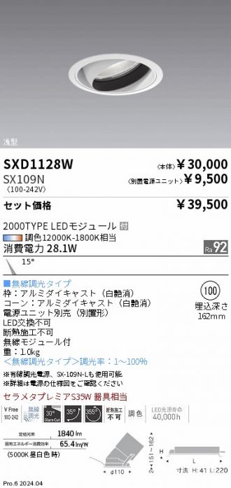 [機能/他] 2000TYPE LEDモジュール付調色12000K-1800K相当消費電力 28.1W15°■無線調光タイプ枠:アルミダイキャスト(白艶消)コーン:アルミダイキャスト(白艶消)電源ユニット別売(別置形)LED交換不可断熱施工不可無線モジュール付重:1.0kg<無線調光タイプ>調光率:1-100%※有線調光電源、SX-109N-Lも使用可能※詳細は電源の仕様図をご確認ください162mm定格光束:1840lm (65.4lm/W)(5000K 昼白色 時)セラメタプレミアS35W 器具相当