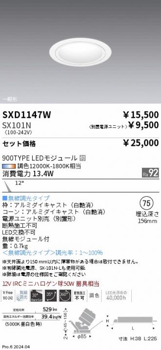 [機能/他] 900TYPE LEDモジュール付調色12000K-1800K相当消費電力 13.4W12°■無線調光タイプ枠:アルミダイキャスト(白艶消)コーン:アルミダイキャスト(白艶消)電源ユニット別売(別置形)断熱施工不可LED交換不可無線モジュール付重:0.7kg<無線調光タイプ>調光率:1-100%※天井面より150 mm以内に障害物がある場合は取付できません。※有線調光電源、SX-101N-Lも使用可能※詳細は電源の仕様図をご確認ください156mm定格光束:529lm (39.4lm/W)(5000K 昼白色 時)12V IRCミニハロゲン球50W 器具相当