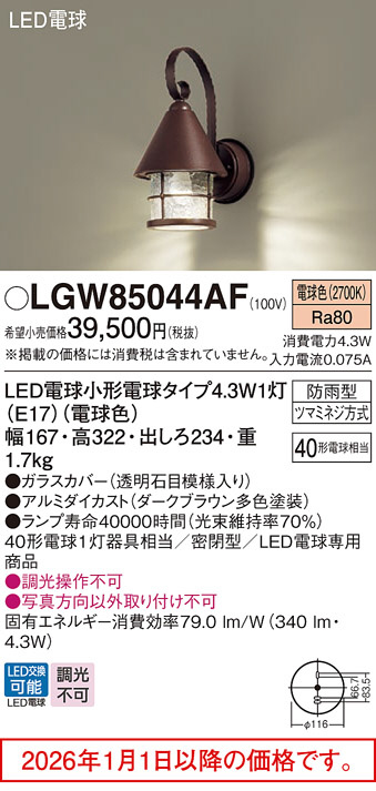 [機能/他] ランプ同梱包光源◆LED電球小形電球タイプ4.3W1灯(E17)(電球色) ◆色温度:2700 K ◆光源寿命40000時間(光束維持率70%)寸法・質量◆幅:167 mm ◆高:322 mm ◆出しろ:234 mm◆質量:1.7 kg仕様・注意事項◆器具光束:340 lm ◆電圧:100 V ◆消費電力:4.3 W ◆消費効率:79 lm/W◆デザイン分類:Frech Chic◆【ガラスカバー】透明石目模様入り◆【アルミダイカスト】ダークブラウン多色塗装◆壁直付型、密閉型◆Ra80◆40形電球1灯器具相当◆密閉型◆LED電球専用商品◆入力電流(100V時):0.075 A◆調光操作不可◆写真方向以外取り付け不可