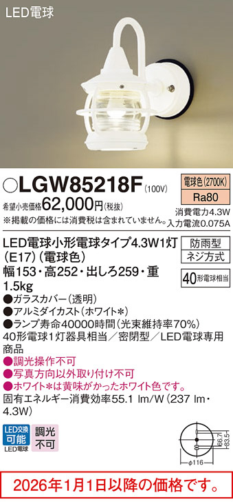 [機能/他] ランプ同梱包光源◆LED電球小形電球タイプ4.3W1灯(E17)(電球色) ◆色温度:2700 K ◆光源寿命40000時間(光束維持率70%)寸法・質量◆幅:153 mm ◆高:252 mm ◆出しろ:259 mm◆質量:1.5 kg仕様・注意事項◆器具光束:237 lm ◆電圧:100 V ◆消費電力:4.3 W ◆消費効率:55.1 lm/W◆デザイン分類:Vitage◆【ガラスカバー】透明◆【アルミダイカスト】ホワイト◆壁直付型、密閉型◆Ra80◆40形電球1灯器具相当◆密閉型◆LED電球専用商品◆入力電流(100V時):0.075 A◆調光操作不可◆写真方向以外取り付け不可