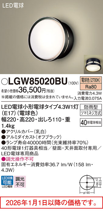 [機能/他] ランプ同梱包光源◆LED電球小形電球タイプ4.3W1灯(E17)(電球色) ◆色温度:2700 K ◆光源寿命40000時間(光束維持率70%)寸法・質量◆幅:220 mm ◆高:220 mm ◆出しろ:110 mm◆質量:1.4 kg仕様・注意事項◆器具光束:158 lm ◆電圧:100 V ◆消費電力:4.3 W ◆消費効率:36.7 lm/W◆デザイン分類:Stylish Moder◆【アクリルカバー】乳白◆【アルミダイカスト】オフブラック◆天井直付型・壁直付型◆Ra80◆40形電球1灯器具相当◆壁面・天井面取付専用◆LED電球専用商品◆入力電流(100V時):0.075 A◆調光操作不可
