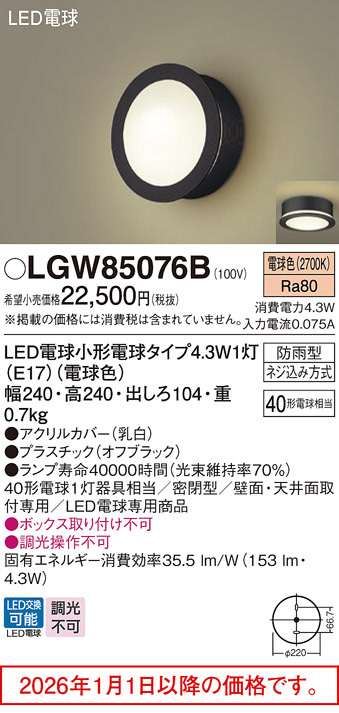 [機能/他] ランプ同梱包光源◆LED電球小形電球タイプ4.3W1灯(E17)(電球色) ◆色温度:2700 K ◆光源寿命40000時間(光束維持率70%)寸法・質量◆幅:240 mm ◆高:240 mm ◆出しろ:104 mm◆質量:0.7 kg仕様・注意事項◆器具光束:153 lm ◆電圧:100 V ◆消費電力:4.3 W ◆消費効率:35.5 lm/W◆デザイン分類:Stylish Moder◆【アクリルカバー】乳白◆【プラスチック】オフブラック◆天井直付型・壁直付型、密閉型◆Ra80◆40形電球1灯器具相当◆密閉型◆壁面・天井面取付専用◆LED電球専用商品◆入力電流(100V時):0.075 A◆ボックス取り付け不可◆調光操作不可