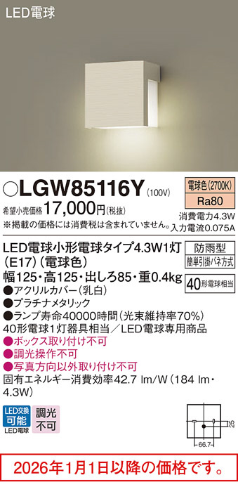 [機能/他] ランプ同梱包光源◆LED電球小形電球タイプ4.3W1灯(E17)(電球色) ◆色温度:2700 K ◆光源寿命40000時間(光束維持率70%)寸法・質量◆幅:125 mm ◆高:125 mm ◆出しろ:85 mm◆質量:0.4 kg仕様・注意事項◆器具光束:184 lm ◆電圧:100 V ◆消費電力:4.3 W ◆消費効率:42.7 lm/W◆デザイン分類:Natural◆【アクリルカバー】乳白◆壁直付型◆Ra80◆40形電球1灯器具相当◆LED電球専用商品◆入力電流(100V時):0.075 A◆ボックス取り付け不可◆調光操作不可◆写真方向以外取り付け不可