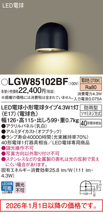 [機能/他] ランプ同梱包光源◆LED電球小形電球タイプ4.3W1灯(E17)(電球色) ◆色温度:2700 K ◆光源寿命40000時間(光束維持率70%)寸法・質量◆幅:126 mm ◆高:115 mm ◆出しろ:99 mm◆質量:0.7 kg仕様・注意事項◆器具光束:111 lm ◆電圧:100 V ◆消費電力:4.3 W ◆消費効率:25.8 lm/W◆デザイン分類:Stylish Moder Casual◆【アクリルパネル】乳白◆【アルミダイカスト】オフブラック◆壁直付型◆Ra80◆40形電球1灯器具相当◆LED電球専用商品◆入力電流(100V時):0.075 A◆調光操作不可◆写真方向以外取り付け不可◆ステンレスなどの金属製の表札は光の反射で見えにくい場合があります。