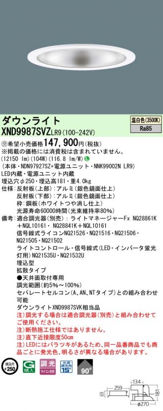 ◆天井埋込型、埋込穴φ250、ビーム角90度・拡散タイプ・光源遮光角15度