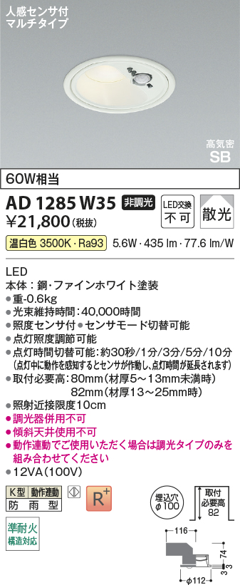 ●幅-φ112 出幅-6 埋込穴径-φ100 埋込高-74mm 重-0.6kg