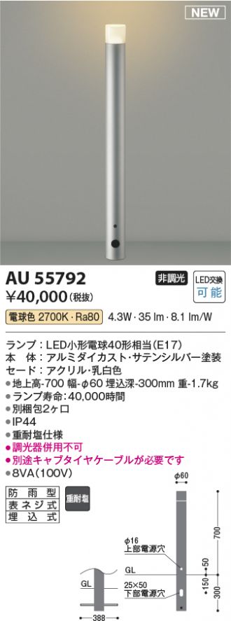 [機能/他] LED(電球色)ランプ:LED小形電球40形相当(E17)本体:アルミダイカスト・サテンシルバー塗装セード:アクリル・乳白色●地上高-700 幅-φ60 埋込深-300mm 重-1.7kg●消費電力:4.3W●定格光束:35 lm●固有エネルギー消費効率:8.1 lm/W●演色性:Ra80●色温度:2700K●ランプ寿命:40,000時間●別梱包2ヶ口●IP44●重耐塩仕様●調光器併用不可●別途キャブタイヤケーブルが必要です●8VA(100V)