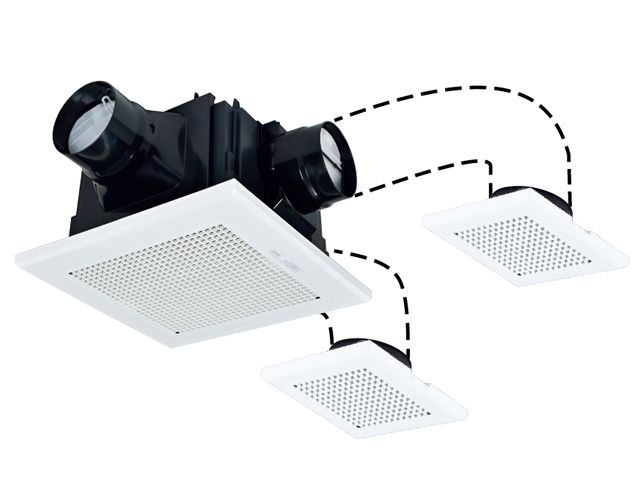 [機能/他] 主な機能・仕様・グリル部と羽根部にデュアルバリアマテリアル採用・高効率羽根「デルタシロッコファンβ」採用・3部屋同時換気・風量調節板付(本体グリル裏面部)・副吸込グリル付(2個、グリル部分着脱可能)・副吸込3方向選択可能・低騒音設計・高密閉風圧式シャッター搭載(排気側)・テーピングが容易な段付構造のダクト接続口採用(フレキダクト接続時)・塩ビ管接続時のダクト方向微調整可能(全方向7°)・速結端子接続・本体スライド脱着式