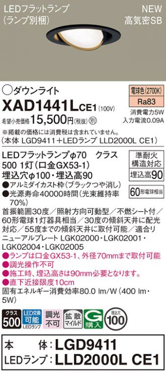 [機能/他] ランプ別梱包光源◆LEDフラットランプφ70 クラス500 1灯(口金GX53-1)◆色温度:2700 K◆光源寿命40000時間(光束維持率70%)寸法・質量◆埋込穴径:φ100 mm◆埋込高:90 mm仕様・注意事項◆器具光束:400 lm◆電圧:100 V◆消費電力:5 W◆消費効率:80 lm/W◆【アルミダイカスト枠】ブラックつや消し◆天井埋込型、埋込穴φ100、浅型9H・高気密SB形・拡散タイプ(マイルド配光)◆Ra83【適合リニューアルプレート】LGK02000【適合リニューアルプレート】LGK02001【適合リニューアルプレート】LGK02004【適合リニューアルプレート】LGK02005◆首振範囲30度◆照射方向可動型◆不燃シート付◆60形電球1灯器具相当◆30度の傾斜天井に配光対応◆55度までの傾斜天井に取付可能◆入力電流(100V時):0.09 A◆ランプは口金GX53-1、外径70mmまで取付可能◆調光操作不可◆施工時、埋込高さは90mm必要となります。◆直下近接限度10cm