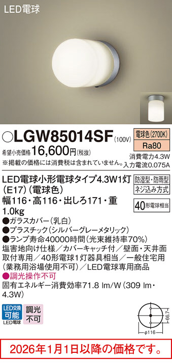[機能/他] 発光ダイオード(LED)4.3W1kg幅116・高116・出しろ171ガラスカバー(乳白)・プラスチック(シルバーグレーメタリック)