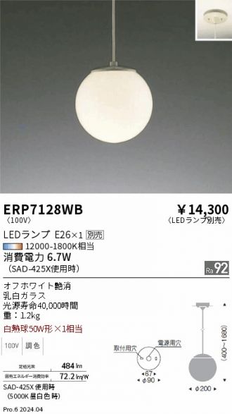 [機能/他] 〈LEDランプ別売〉LEDランプ E26x1別売12000-1800K相当消費電力 6.7W(SAD-425X使用時)オフホワイト艶消乳白ガラス光源寿命40,000時間重:1.2kg定格光束:484lm (72.2lm/W)SAD-425X 使用時(5000K 昼白色 時)白熱球50W形×1相当