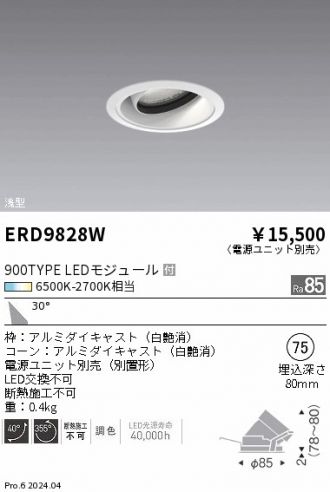 [機能/他] 〈電源ユニット別売〉900TYPE LEDモジュール付6500K-2700K相当30°枠:アルミダイキャスト(白艶消)コーン:アルミダイキャスト(白艶消)電源ユニット別売(別置形)LED交換不可断熱施工不可重:0.4kg80mm