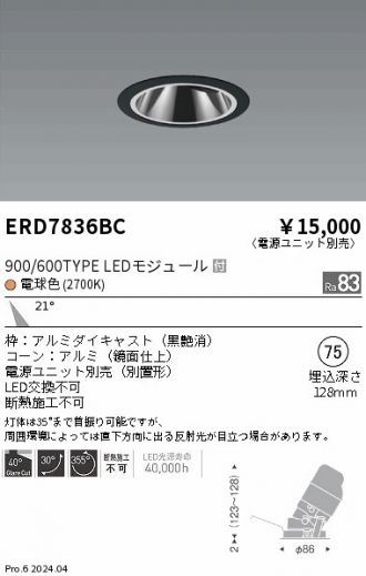 [機能/他] 〈電源ユニット別売〉900/600TYPE LEDモジュール付電球色21°枠:アルミダイキャスト(黒艶消)コーン:アルミ(鏡面仕上)電源ユニット別売(別置形)LED交換不可断熱施工不可灯体は35°まで首振り可能ですが、周囲環境によっては直下方向に出る反射光が目立つ場合があります。128mm