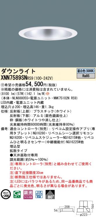 ◆天井埋込型、埋込穴φ200、ビーム角80度・拡散タイプ・光源遮光角15度