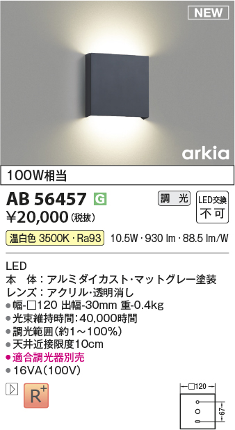 [機能/他] LED(温白色)100W相当LED本体:アルミダイカスト・マットグレー塗装レンズ:アクリル・透明消し●幅-□120 出幅-30mm 重-0.4kg●消費電力:10.5W●定格光束:930 lm●固有エネルギー消費効率:88.5 lm/W●演色性:Ra93●色温度:3500K●光束維持時間:40,000時間●調光範囲(約1~100%)●天井近接限度10cm●適合調光器別売●16VA(100V)