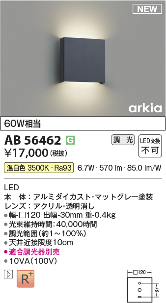 [機能/他] LED(温白色)60W相当LED本体:アルミダイカスト・マットグレー塗装レンズ:アクリル・透明消し●幅-□120 出幅-30mm 重-0.4kg●消費電力:6.7W●定格光束:570 lm●固有エネルギー消費効率:85.0 lm/W●演色性:Ra93●色温度:3500K●光束維持時間:40,000時間●調光範囲(約1~100%)●天井近接限度10cm●適合調光器別売●10VA(100V)