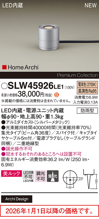 [機能/他] LED内蔵、電源ユニット内蔵光源◆LED(高演色・電球色タイプ)◆色温度:2700 K◆光束維持時間40000時間(光束維持率70%)寸法・質量◆質量:1.3 kg仕様・注意事項◆器具光束:250 lm◆電圧:100 V◆消費電力:6.9 W◆消費効率:36.2 lm/W◆【アルミダイカスト】シルバーメタリック◆据置取付型、美ルック・ビーム角36度・集光タイプ・スパイク付◆高演色Ra95◆集光タイプ(ビーム角36度)◆スパイク付◆キャブタイヤケーブル5m付◆電源プラグなし(ケーブルグランド同梱)◆二重絶縁型◆入力電流(100V時):0.13 A◆調光操作不可◆冠水するおそれのあるところへは設置不可
