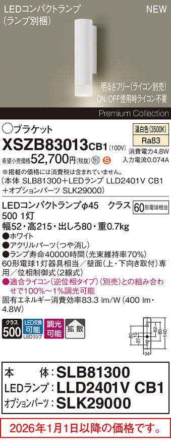 壁直付型 LED(温白色) ブラケット 拡散タイプ LEDコンパクトランプ交換型・調光タイプ(ライコン別売) 白熱電球60形1灯器具相当(SLB81300+LLD2401VCB1+SLK29000)