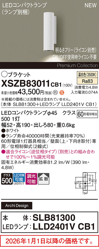 壁直付型 LED(温白色) ブラケット 拡散タイプ LEDコンパクトランプ交換型・調光タイプ(ライコン別売) 白熱電球60形1灯器具相当(SLB81300+LLD2401VCB1)
