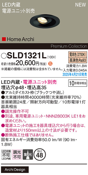 [機能/他] LED内蔵、電源ユニット別売光源◆LED(高演色・電球色タイプ)◆色温度:2700 K◆光束維持時間40000時間(光束維持率70%)寸法・質量◆埋込穴径:φ48 mm◆埋込高:35 mm仕様・注意事項◆全光束:90 lm◆電圧:100 V◆消費電力:1.8 W◆消費効率:50 lm/W◆【アルミダイカスト枠】ブラックつや消し◆天井埋込型、埋込穴φ48、集光タイプ◆高演色Ra93◆首振範囲24度◆照射方向可動型◆10形電球1灯器具相当◆入力電流(100V時):0.045 A◆調光操作不可◆別途、専用電源ユニット・NNN28003K LE1をお求めください。◆電源ユニットの施工を器具埋込穴から行う場合は、造営材より150mm以上の寸法が必要です。◆断熱施工仕様ではありません。