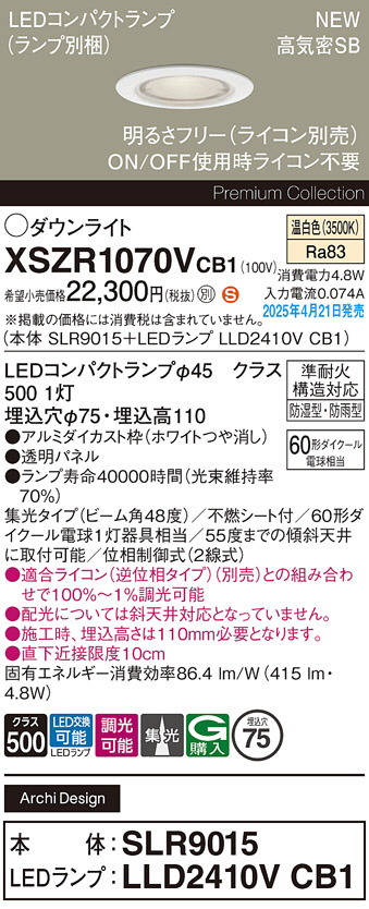 天井埋込型 LED(温白色) 軒下用ダウンライト・ポーチライト 高気密SB形・ビーム角48度・集光タイプ LEDコンパクトランプ交換型・防湿型・防雨型・調光タイプ(ライコン別売)/埋込穴φ75 パネル付型 110Vダイクール電球60形1灯器具相当(SLR9015+LLD2410VCB1)