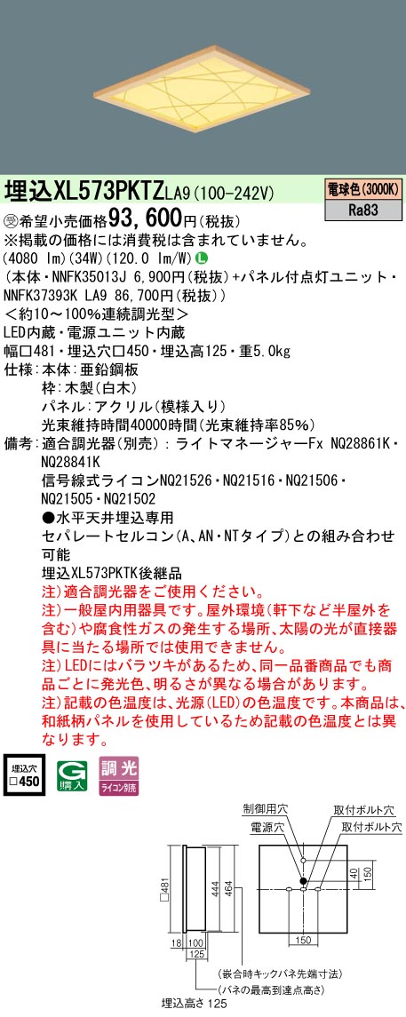 天井埋込型 LED(電球色) 一体型LEDベースライト 和紙柄パネル(竹模様) 連続調光型調光タイプ(ライコン別売) スクエアタイプ/パネル付型 コンパクト形蛍光灯FHP32形3灯器具相当 FHP32形3灯(NNFK35013J+NNFK37393KLA9)