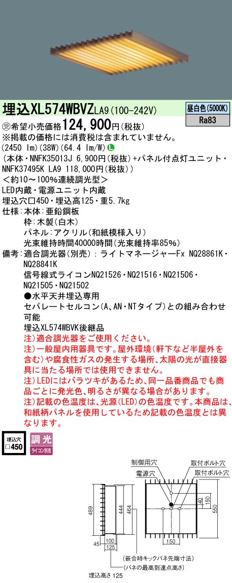 天井埋込型 LED(昼白色) 一体型LEDベースライト 和紙柄パネル(木製ルーバ) 連続調光型調光タイプ(ライコン別売) スクエアタイプ/パネル付型 コンパクト形蛍光灯FHP32形4灯器具相当 FHP32形4灯(NNFK35013J+NNFK37495KLA9)
