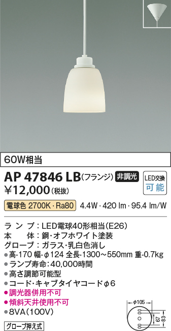 [機能/他] LED(電球色)60W相当ランプ:LED電球40形相当(E26)本体:鋼・オフホワイト塗装グローブ:ガラス・乳白色消し●高-170 幅-φ124 全長-1300~550mm 重-0.7kg●消費電力:4.4W●定格光束:420 lm●固有エネルギー消費効率:95.4 lm/W●演色性:Ra80●色温度:2700K●ランプ寿命:40,000時間●高さ調節可能型●コード・キャブタイヤコードφ6●調光器併用不可●傾斜天井使用不可●8VA(100V)