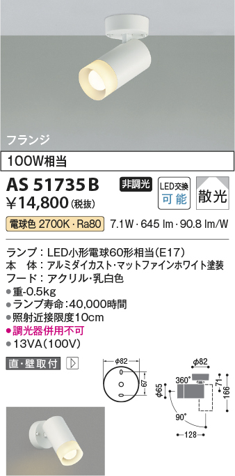 [機能/他] LED(電球色)100W相当ランプ:LED小形電球60形相当(E17)本体:アルミダイカスト・マットファインホワイト塗装フード:アクリル・乳白色●高-166 本体幅-φ65 本体長-128mm 重-0.5kg●消費電力:7.1W●定格光束:645 lm●固有エネルギー消費効率:90.8 lm/W●演色性:Ra80●色温度:2700K●ランプ寿命:40,000時間●照射近接限度10cm●調光器併用不可●13VA(100V)