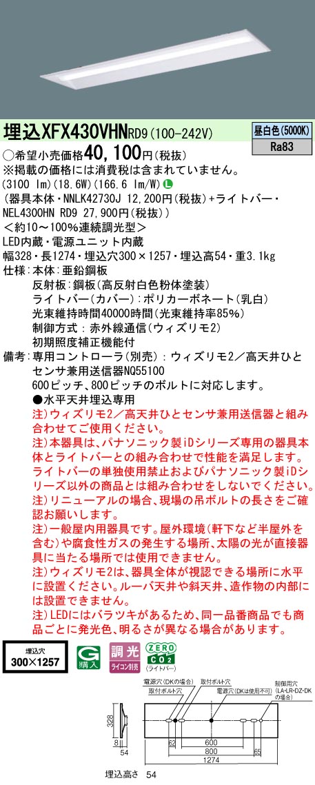 天井埋込型 40形 一体型LEDベースライト 連続調光型調光タイプ(ウィズリモ用送信器別売) 下面開放型 Hf蛍光灯32形高出力型1灯器具相当 Hf32形高出力型・3200 lm(NNLK42730J+NEL4300HNRD9)