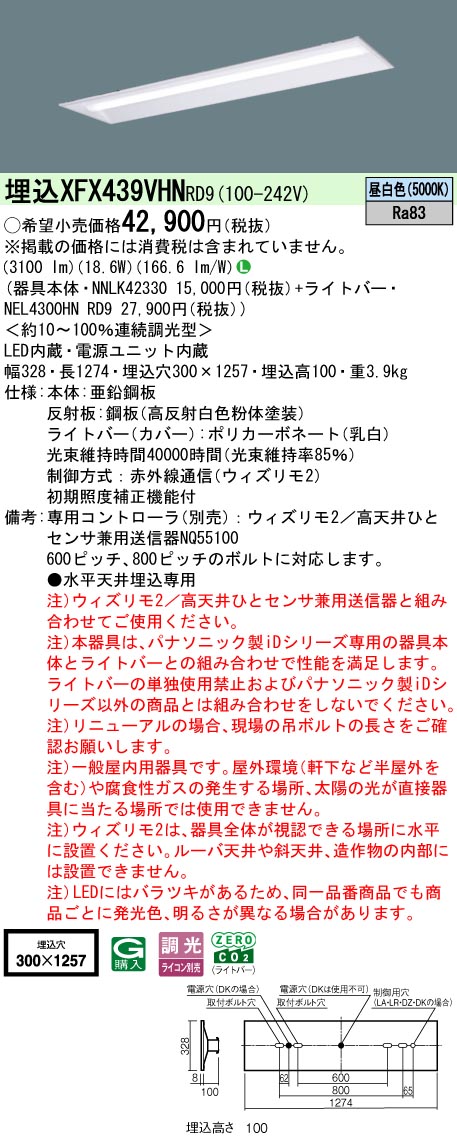 リニューアル用 天井埋込型 40形 一体型LEDベースライト 連続調光型調光タイプ(ウィズリモ用送信器別売) 下面開放型 Hf蛍光灯32形高出力型1灯器具相当 Hf32形高出力型・3200 lm(NNLK42330+NEL4300HNRD9)