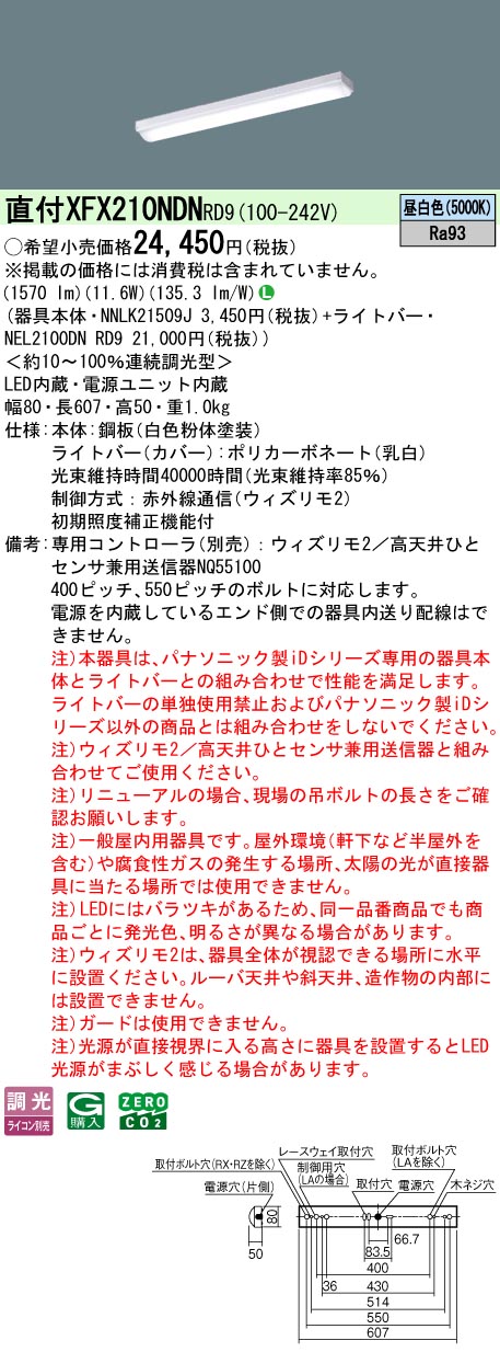 天井直付型 20形 一体型LEDベースライト 連続調光型調光タイプ(ウィズリモ用送信器別売) iスタイル/ストレートタイプ/笠なし型 Hf蛍光灯16形高出力型1灯器具相当 Hf16形高出力型・1600 lm(NNLK21509J+NEL2100DNRD9)